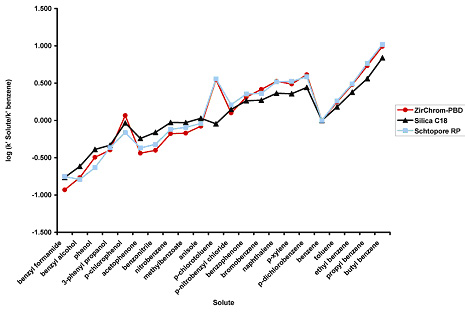 A selectivity comparison utilizing a set of 22 non-electrolyte solutes were analyzed using Sachtopore-RP, ZirChrom-PBD, and a standard silica-C18 column. No major selectivity differences between the ZirChrom-PBD and Sachtopore-RP columns (see Figure 8. retention data normalized to benzene).