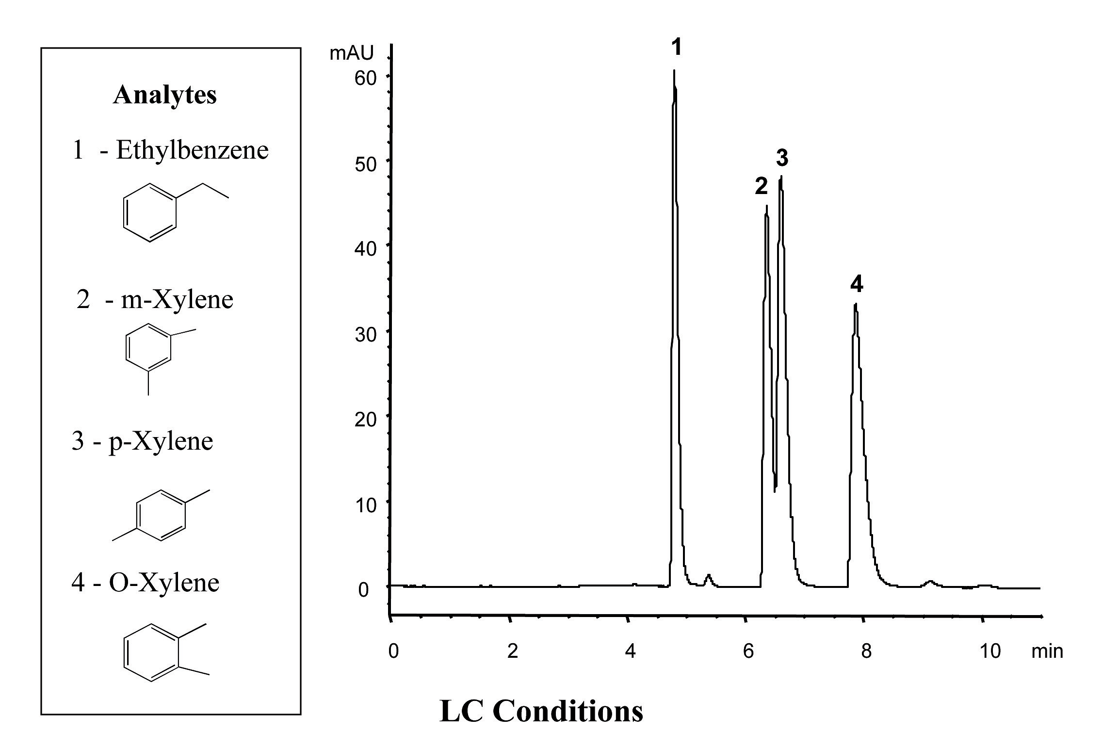 Figure 8. Isomer Separation on ZirChrom®-CARB. Separation of (1) Ethylbenzene, (2) m-Xylene, (3) p-Xylene, and (4) O-Xylene on ZirChrom®-CARB, 150 x 4.6 mm i.d. (P/N ZR01-1546); Mobile Phase: 50/50 Acetonitrile/Water; Flow Rate: 1.0 ml/min; Temperature: 30 degrees C; Detection by UV @ 254nm. Technical Bulletin # 134.