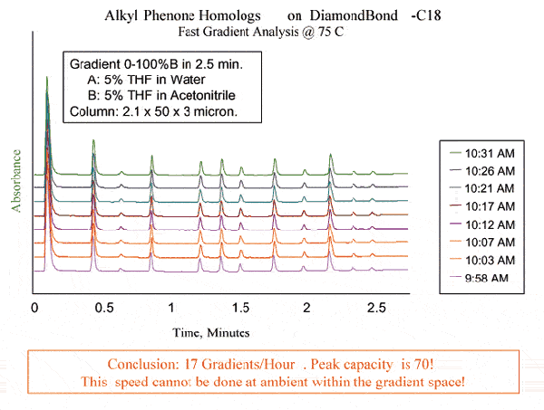 For improved speed, a typical analysis can be done in half the time by going from room temperature to 50 or 60C. Above 100C, it is not uncommon to decrease analysis time by a factor of 5. Also, re-equilibration time for the column is much shorter, so it is possible to do very fast gradient sweeps.