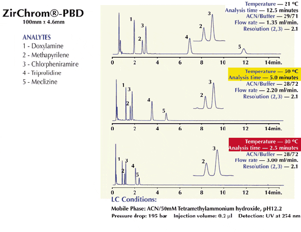 Chromatographers have long known that modest increases in operating temperature can dramatically improve both the efficiency and speed of an HPLC separation. For example, in a recent article, David V. McCalley found large increases in the efficiency for basic compounds at elevated temperature 1. McCalley suggested both that basic compounds should be analyzed at higher temperatures and that new columns should be developed that are stable at high temperature.